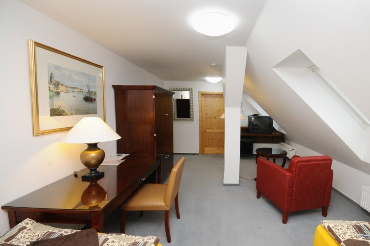 Nr 4 - apartmentTwo rooms, the garden view bedroom - 24,75 m2 – one double bed 190 x 208 cm, the street view room - 16,25 m2 - two single beds 103 x 208 cm, WC and bathroom (6,60 m2) with shower enclosure, hairdryer, TV with ground signal and also satellite TV receiver, mini-bar, WI-FI, solid internet connection, personal strong box safes in the reception.